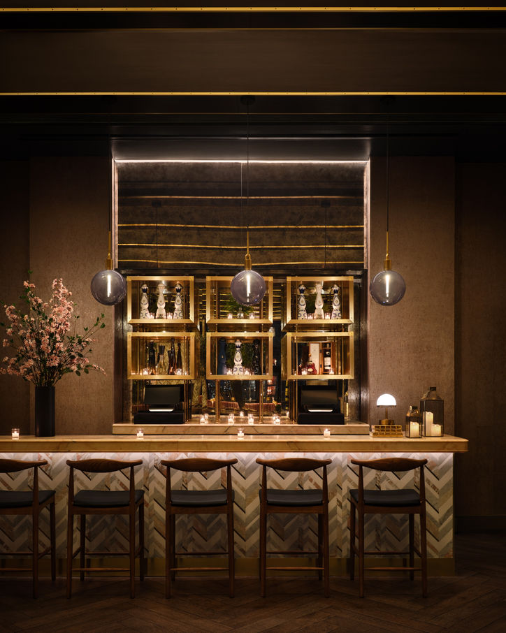 The industrial loft-inspired dining room features a chevron hardwood floors with a curved beamed ceiling, a blush pink marble bar, intimate vintage rose velvet banquette seating, and a dramatic circular communal table with a ten-foot olive tree centerpiece that offers ‘a canopy’ for guests’ dining experience. A gorgeous wrap-around terrace is filled with lush greenery, bromeliads, and palms creating the ultimate outdoor oasis. During the colder months, the terrace has operable walls so that guests can enjoy the space throughout the year.